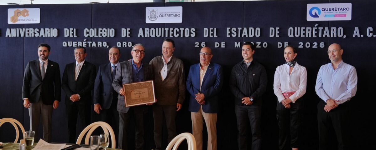 March 26, 2026El gobernador de Querétaro, Mauricio Kuri González, encabezó la toma de protesta de Gilberto Cabrera Palacios como presidente del XXVIII Consejo Directivo del Colegio de Arquitectos del Estado de Querétaro, en el marco del 54 aniversario de este organismo.